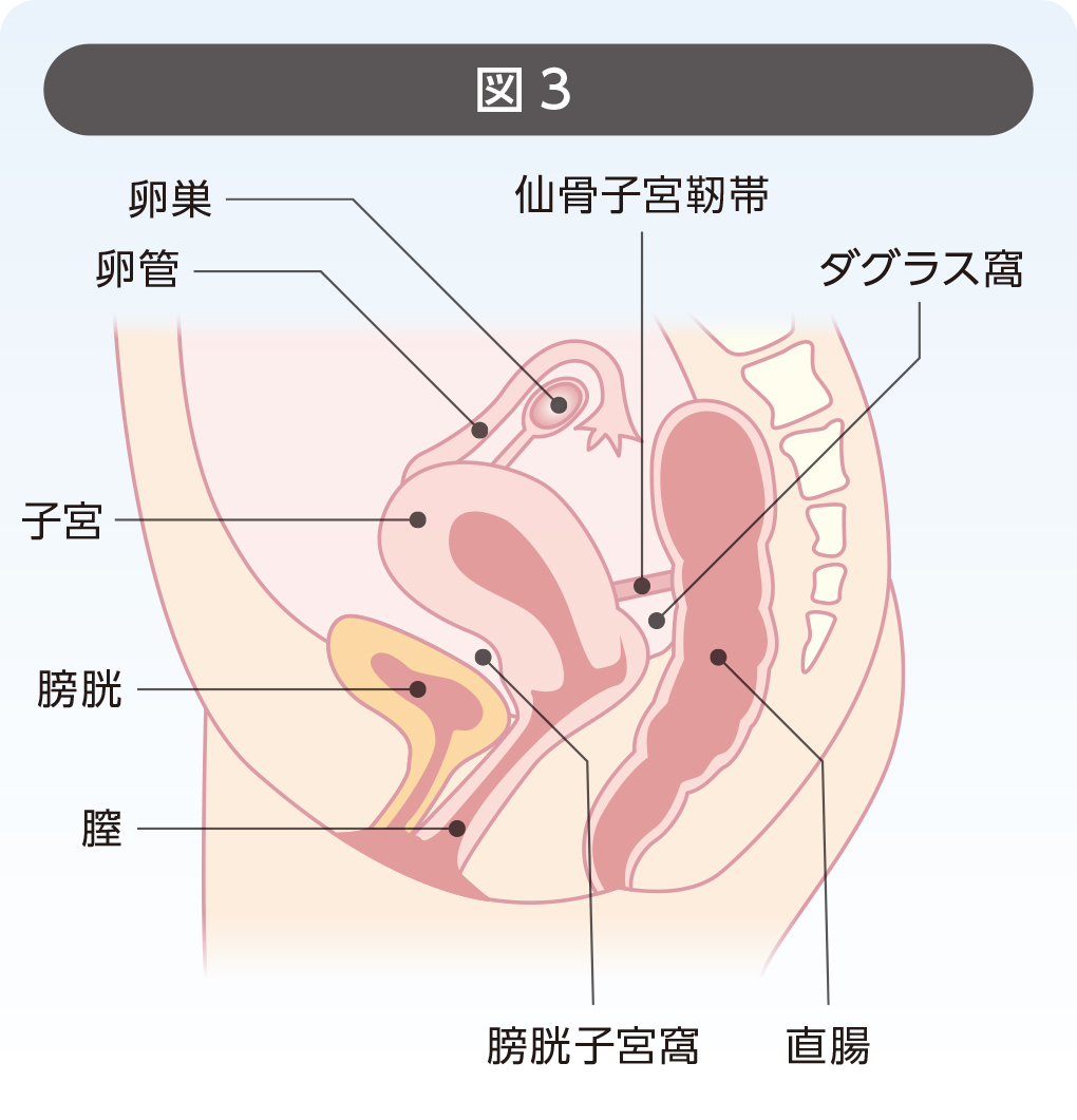 子宮内膜症は、卵巣、ダグラス窩(子宮と直腸の間のくぼみ)、膀胱子宮窩(子宮と膀胱の間のくぼみ)、子宮とその周囲の靭帯、卵管など骨盤の中のさまざまな場所に発生します。